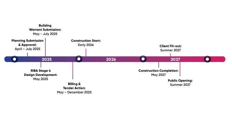 Due to open in Summer 2027 here is a visual timeline to understand the next steps in the project.